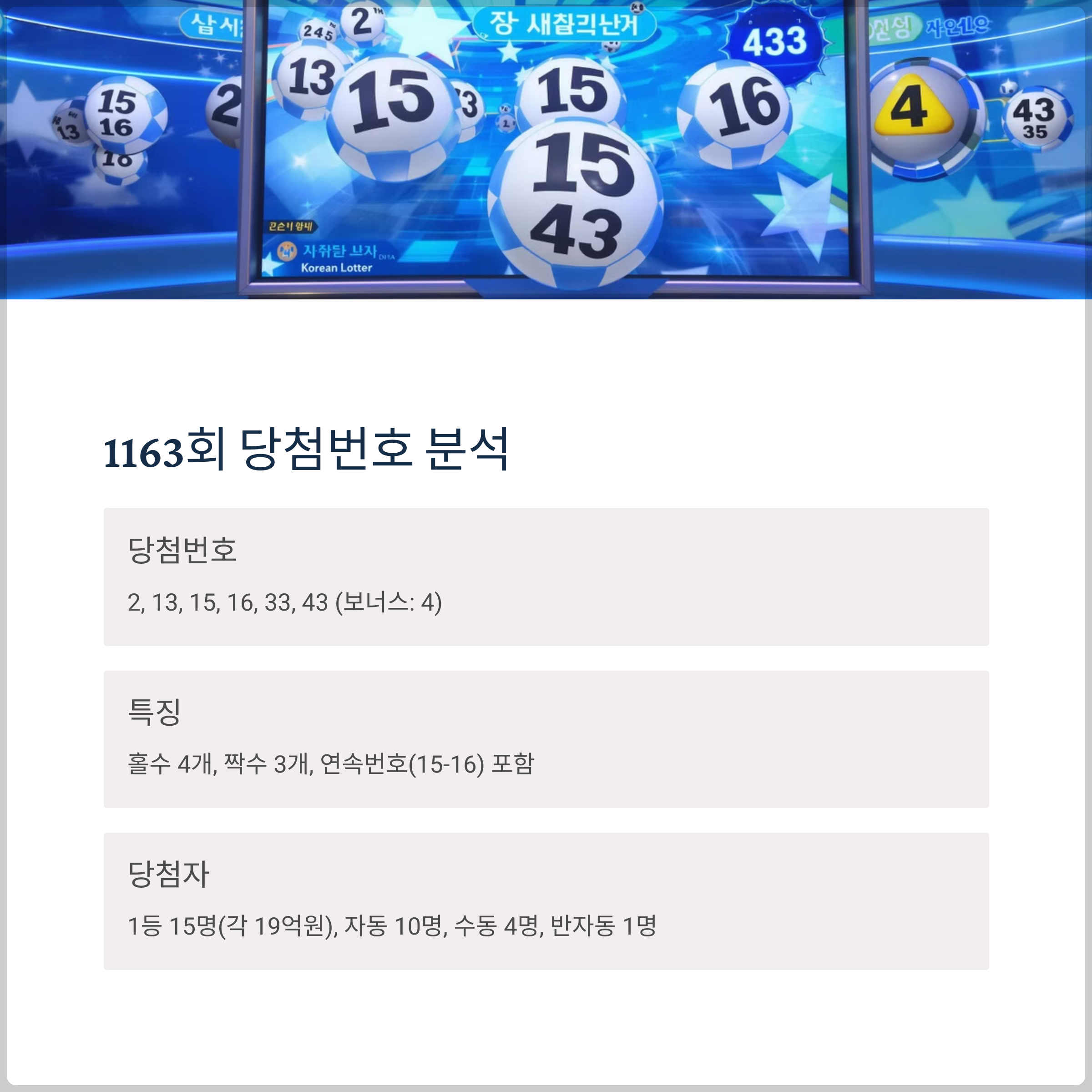 지난 주 1163회(2025년 3월 15일) 당첨번호는 2, 13, 15, 16, 33, 43(보너스: 4)이었습니다.