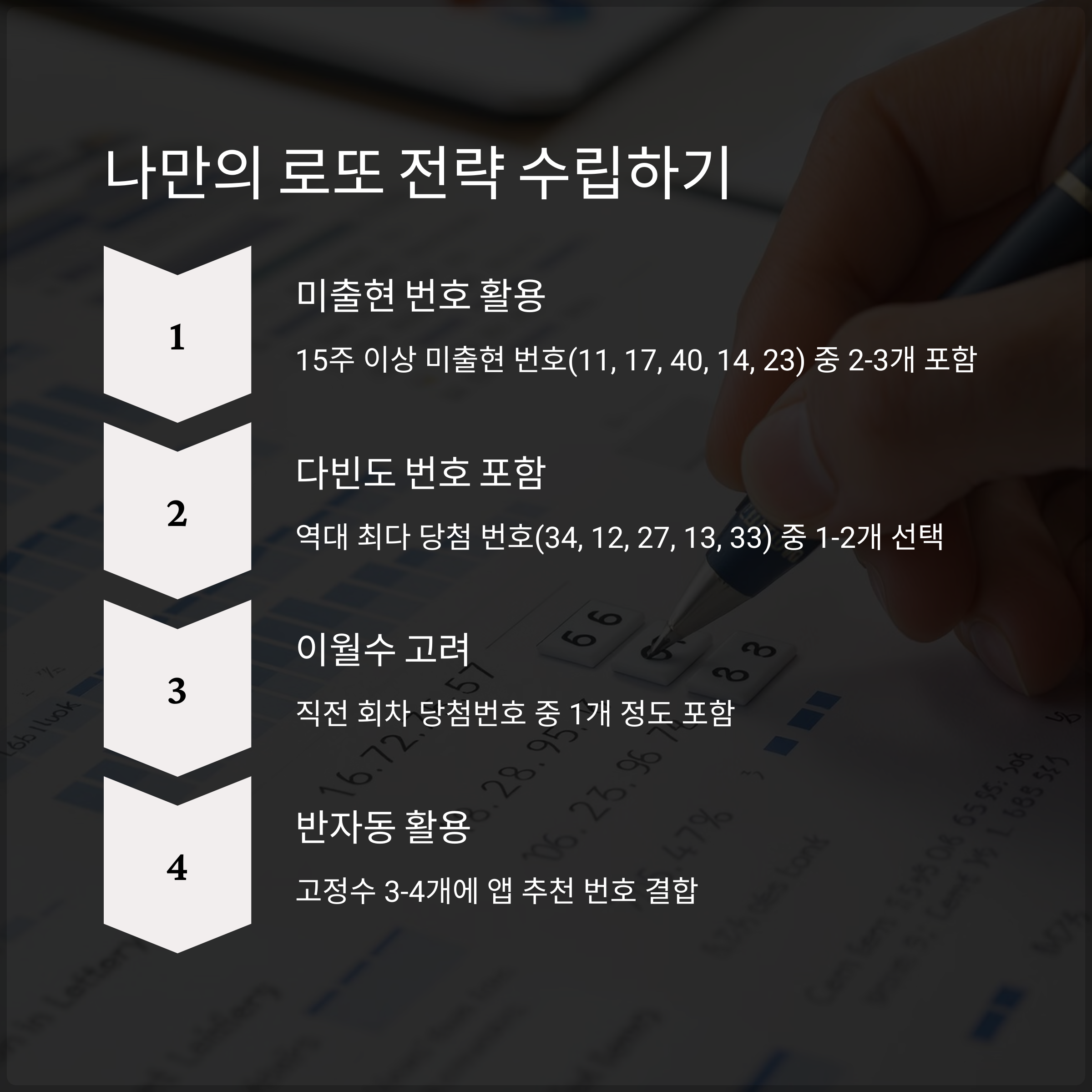 - 최근 미출현 번호 중 2-3개 포함하기: 특히 15주 이상 미출현 번호(11, 17, 40, 14, 23)는 곧 당첨될 가능성이 높습니다.