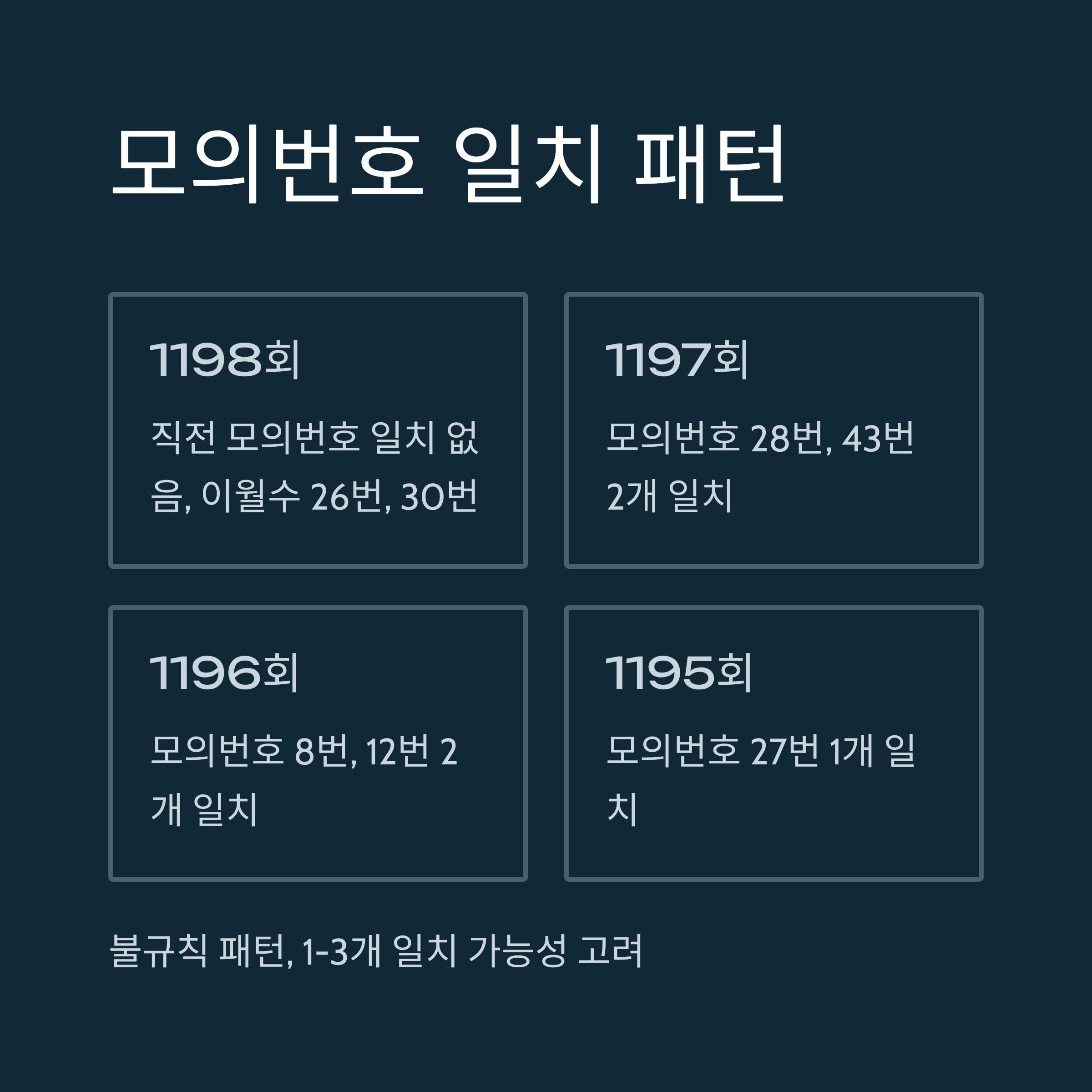 최근 패턴을 분석하면 모의번호 일치 여부가 불규칙하게 나타나고 있습니다. 1196회는 직전 모의번호에서 8번, 12번 2개가 일치했고, 1195회는 27번 1개가 일치했습니다. 1194회는 3번, 13번 2개, 1193회는 16번, 17번 2개가 일치하는 패턴을 보였습니다.