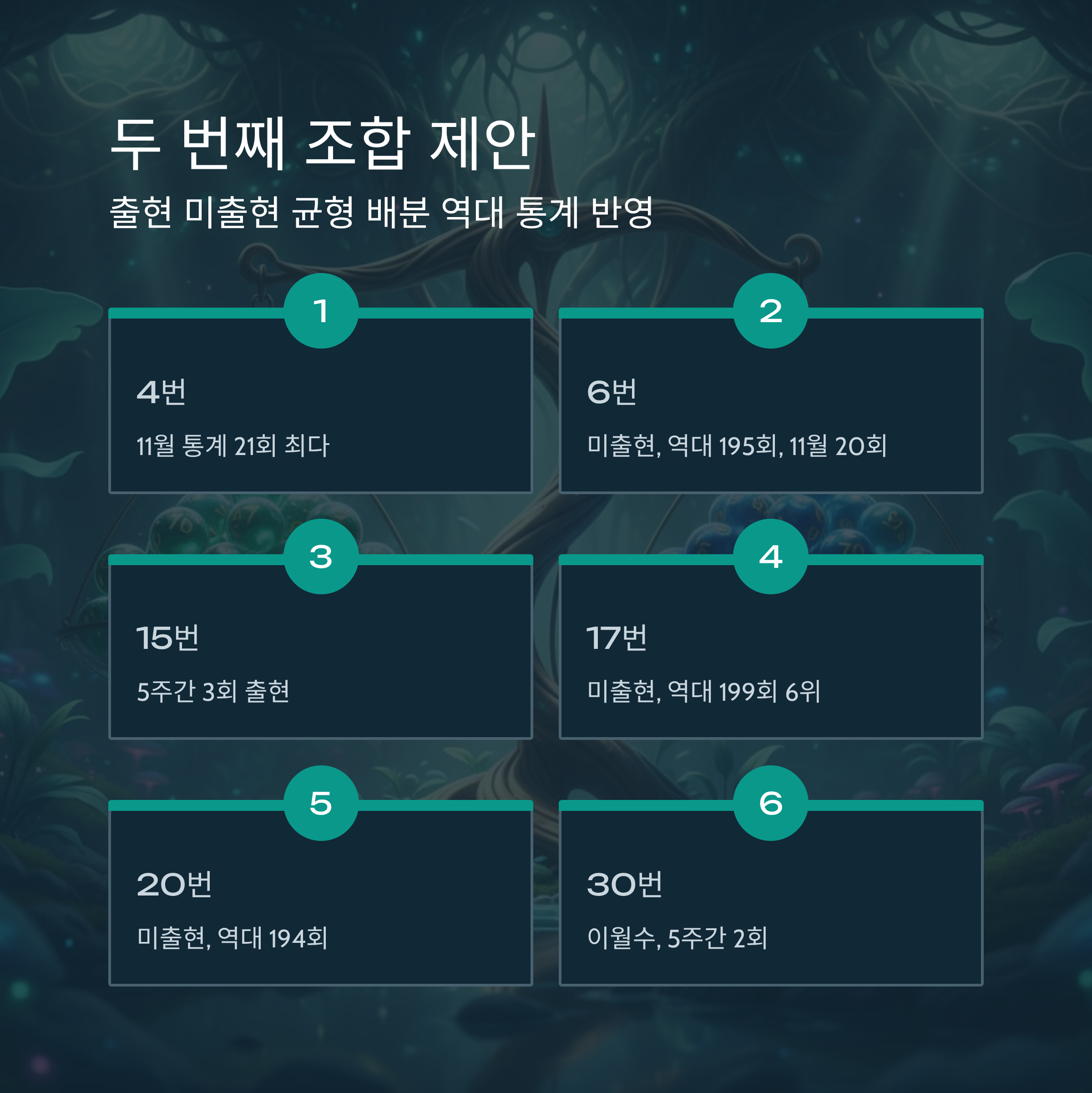 출현번호에서는 15번과 30번을 포함시킵니다. 15번은 5주간 3회 출현했고, 30번은 1198회 이월수이면서 5주간 2회 출현했습니다. 따라서 두 번째 조합은 4, 6, 15, 17, 20, 30번으로 제안합니다.