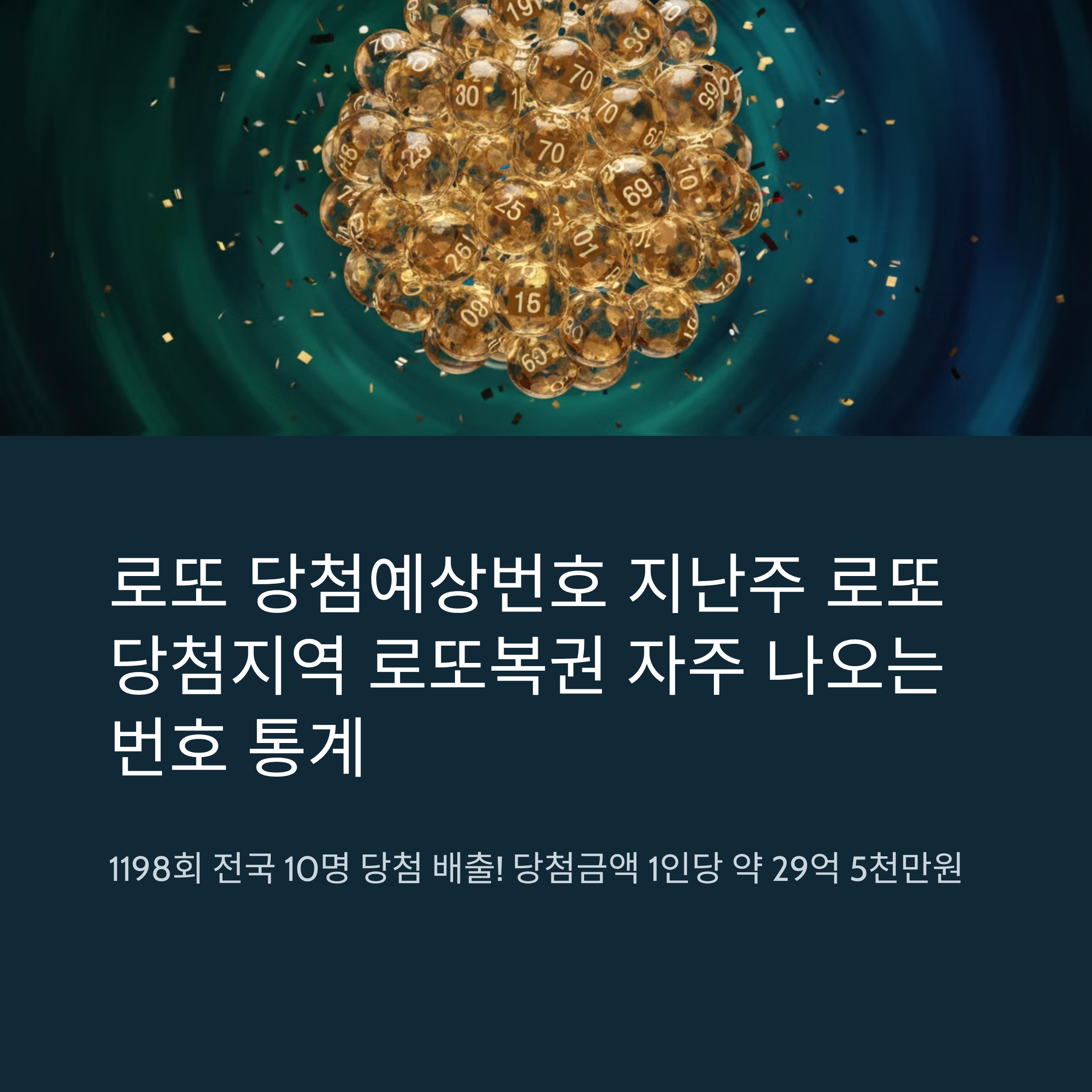 로또 1199회 당첨예상번호를 찾기 위해서는 지난주 1198회 당첨지역 분석부터 시작해야 합니다. 1198회 추첨에서는 전국적으로 10명 당첨자가 배출되었으며, 서울 2명, 전북 전주시 2명을 비롯해 인천, 광주, 대전, 경기 수원시, 강원 원주시, 충남 금산군에서 각각 1명씩 당첨의 기쁨을 누렸습니다. 당첨번호는 26, 30, 33, 38, 39, 41번이었고 보너스 번호는 21번으로, 1인당 당첨금액은 약 29억 5천만원에 달했습니다.