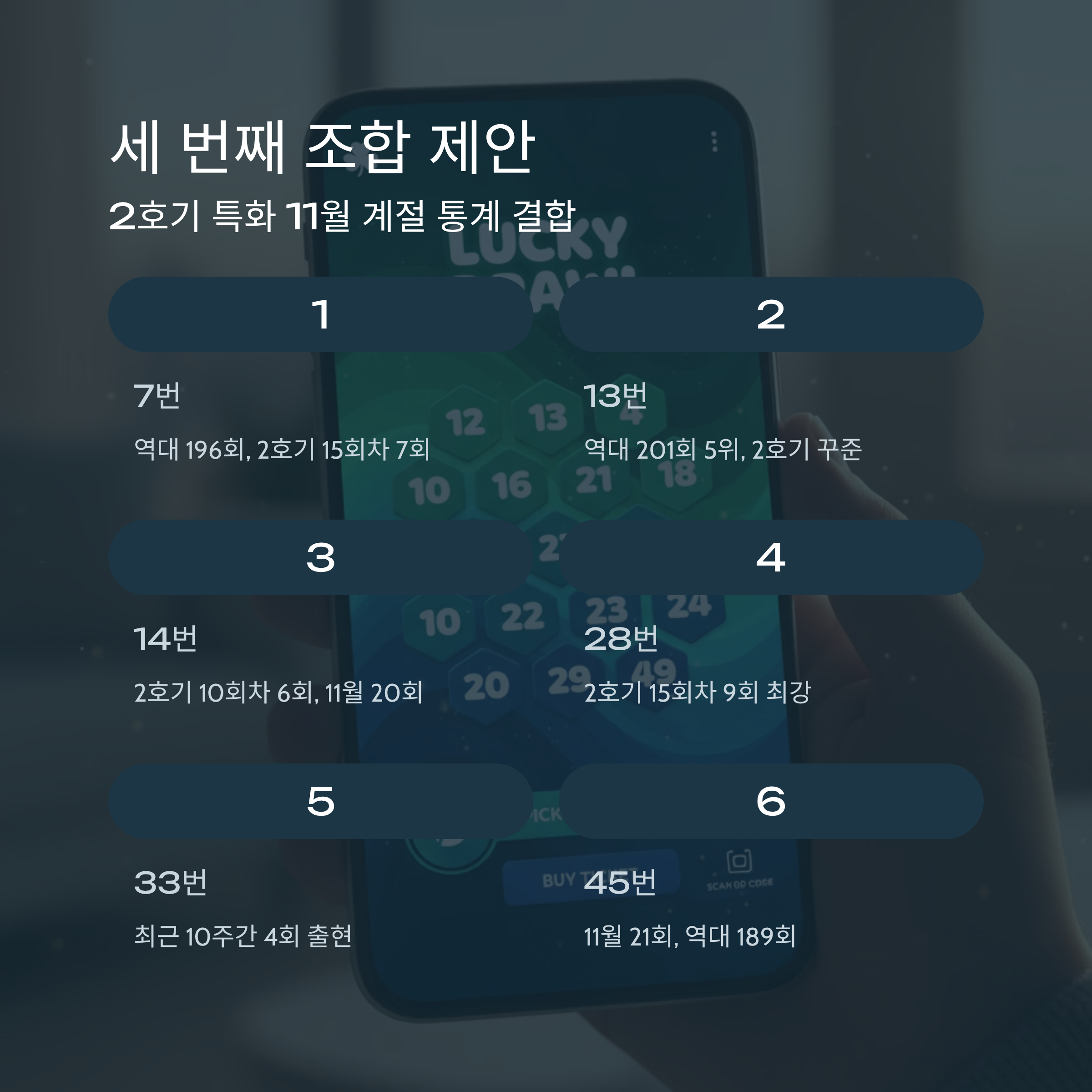 여기에 최근 출현 패턴을 반영하여 33번을 추가합니다. 33번은 최근 10주간 4회 출현한 강력한 후보입니다. 따라서 세 번째 조합은 7, 13, 14, 28, 33, 45번으로 제안합니다.